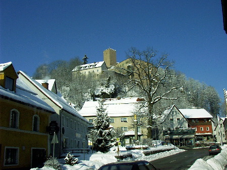 Ortskern von Falkenstein im Winter. Linkerhand der Gasthof "Zur Post" - Lecker Haxe... Oben die Burg.